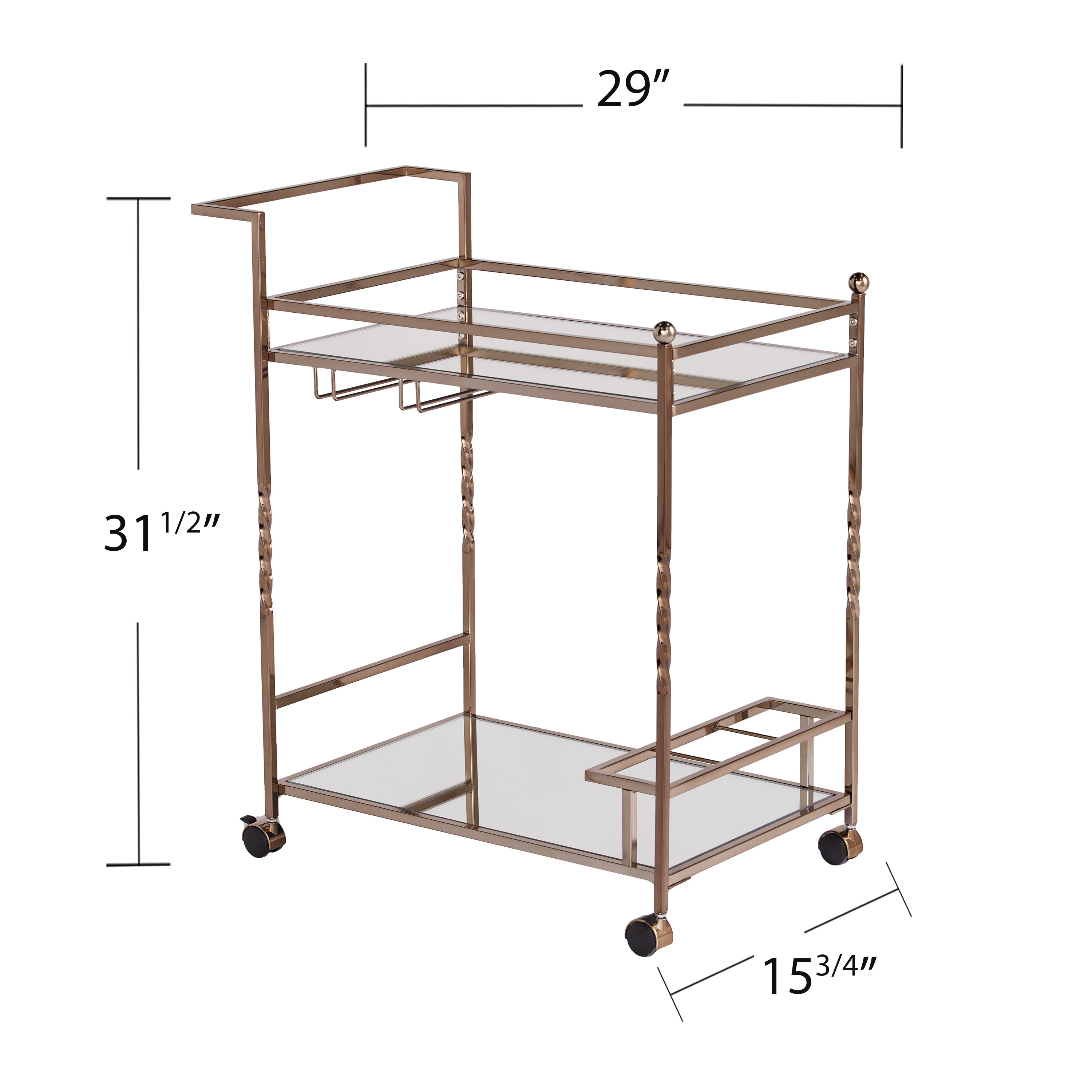 Very pretty and sturdy bar cart. Smaller than I expected but it serves our purpose. The design on this cart makes it looks very delicate and elegant. Very easy to out together. It took me about an hour.
