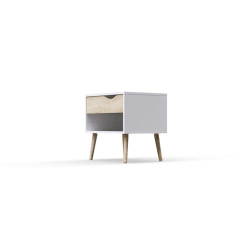 This end table streamlines your space with a contemporary look and extra storage. It's crafted from engineered wood with a rectangular silhouette with a smooth, solid finish, accented with another color for some variation and visual dimension. The body features an open shelf and a drawer with a sleek cutout handle – use it for storing throw blankets, tech, or dinnerware. We love that the legs on this nightstand are flared and tapered, referencing classic mid-century modern style.