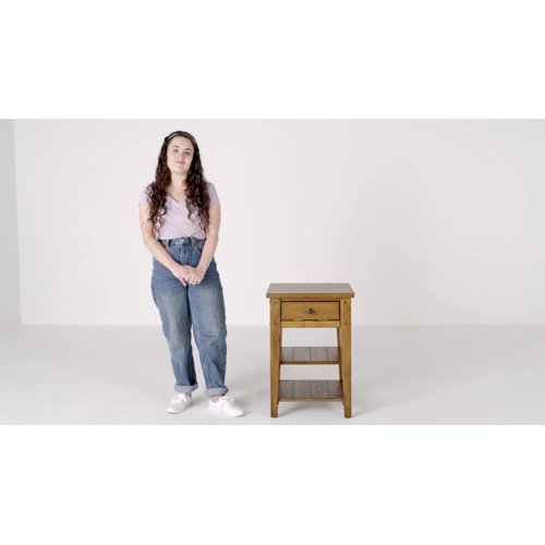 This end table brings casual country style to your bedroom, living room, or parlor. It's made with solid and engineered wood in a classic rectangular design. A flat top rests on four tapered legs, with a single drawer and two open shelves for extra storage. Diamond nailhead detailing and a burnished round drawer pull add a metallic accent. We love that this table has a small footprint of 18" wide and just over 26" high so it fits just right next to your bed to hold a lamp, alarm clock, or phone charger.