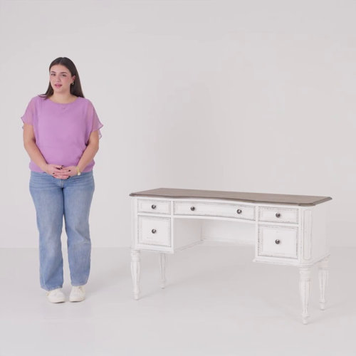 This vanity is your new favorite spot to streamline your morning routine in style. Made from a mix of solid and engineered wood, it sports a two-tone antique white and gray finish that adds a vintage touch to your bedroom or bathroom. Its turned legs and distressed accents give it a classic feel, while five spacious drawers provide ample storage for cosmetics and essentials. The dovetail joinery and full-extension metal slides make accessing your items a breeze. Pair it with a compatible mirror for a complete look.
