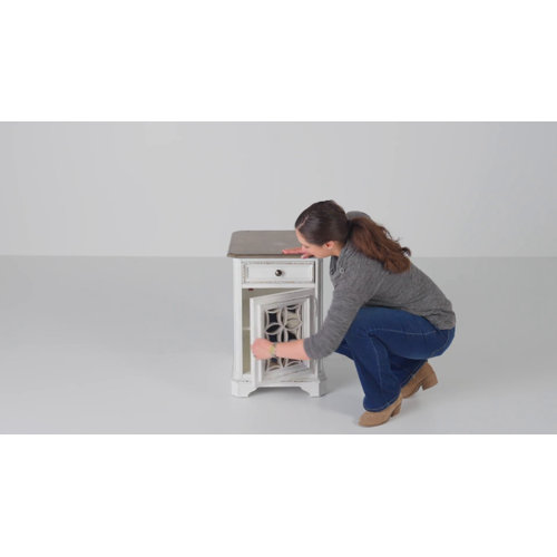 Why not welcome in all the charm of a well-loved family heirloom with this storage side table? It's crafted from solid and engineered wood in a rubbed-through finish for a time-tested look that's just right for the farmhouse living room. This end table with storage has a mirrored cabinet door with geometric fretwork that opens up to two shelves. It also has a top shelf for even more storage space. Last but not least, this table has a weathered tabletop that's the ideal spot for a lamp and some potpourri.
