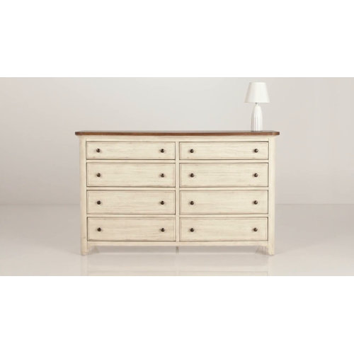 At 66" wide, this 8-drawer double-dresser is just the piece to store clothes, blankets, and other linens in your bedroom. Crafted of pine solids with hickory and pine veneers, featuring distressed panel details on each drawer and both sides for a vintage look. This dresser is finished in an antique white hue, with a contrasting chestnut panel up top that nods to a French country-inspired design. Each drawer has dovetail construction and sits on ball-bearing glides, and the top drawers are lined with felt for delicate items. Plus, a wall anchor is included for added safety. Hand-curated by Kelly Clarkson.