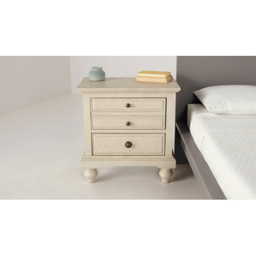 A classic design with a touch of French country-inspired style, this 2-drawer nightstand is the perfect accent for your master or guest bedroom. Showcasing turned bun feet, decorative moldings, and paneled details this nightstand brings a traditional look to the side of your bed. As for storage, there are two drawers: The top drawer is felt-lined to protect delicate items like your tablet or favorite pair of hoops. Made from solid and engineered wood, this nightstand features a weathered off-white finish for antique appeal.