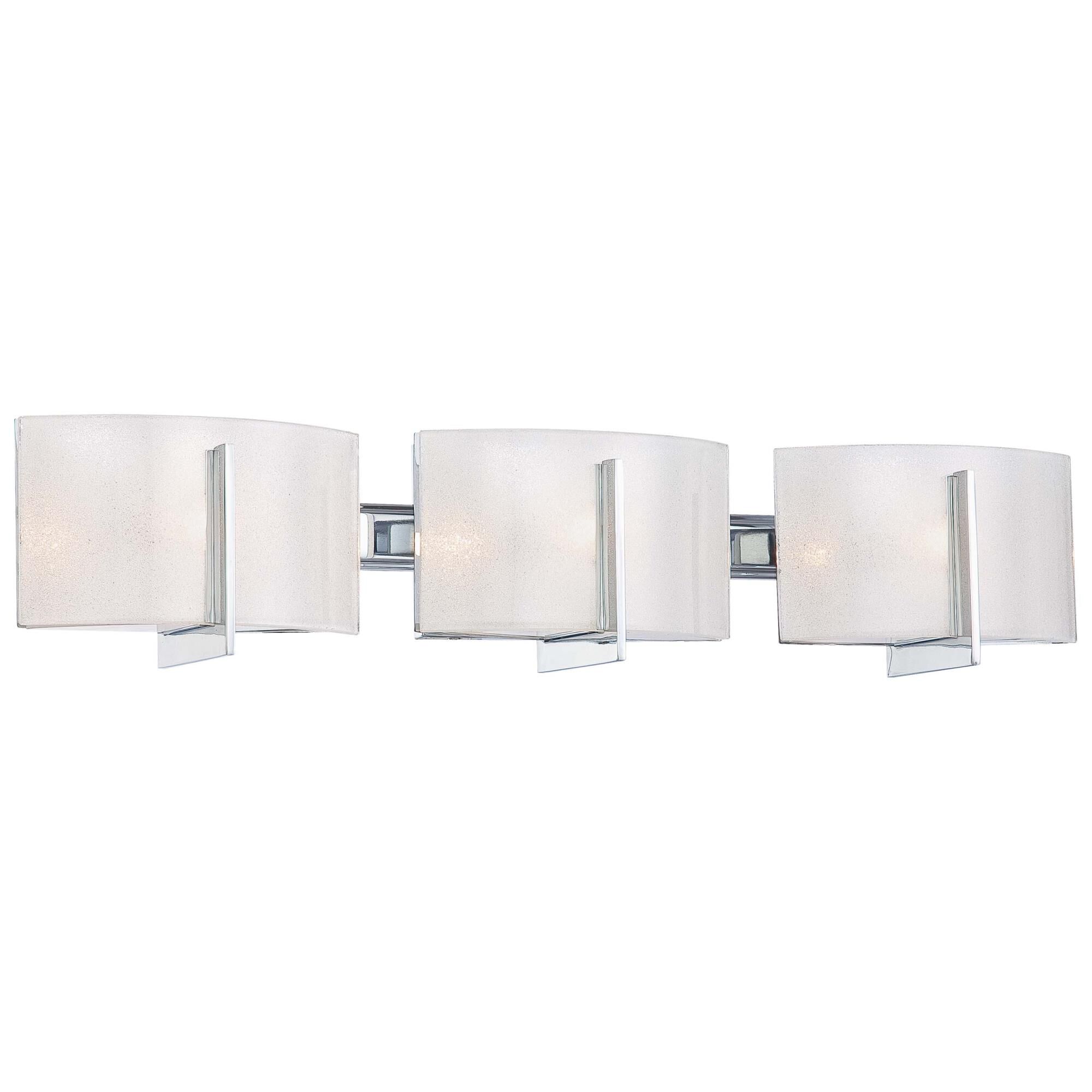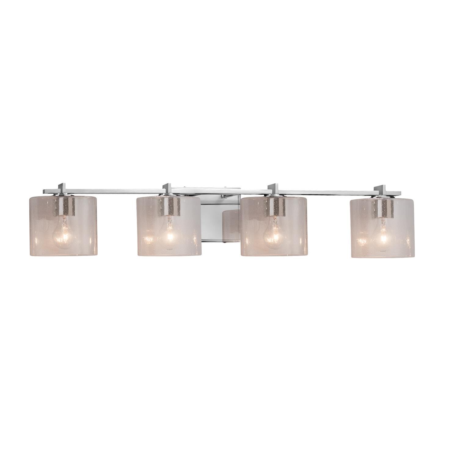 Crystal bead droplets shimmer against chrome hardware on this four light vanity, diffusing the light from the warm matte opal shades.