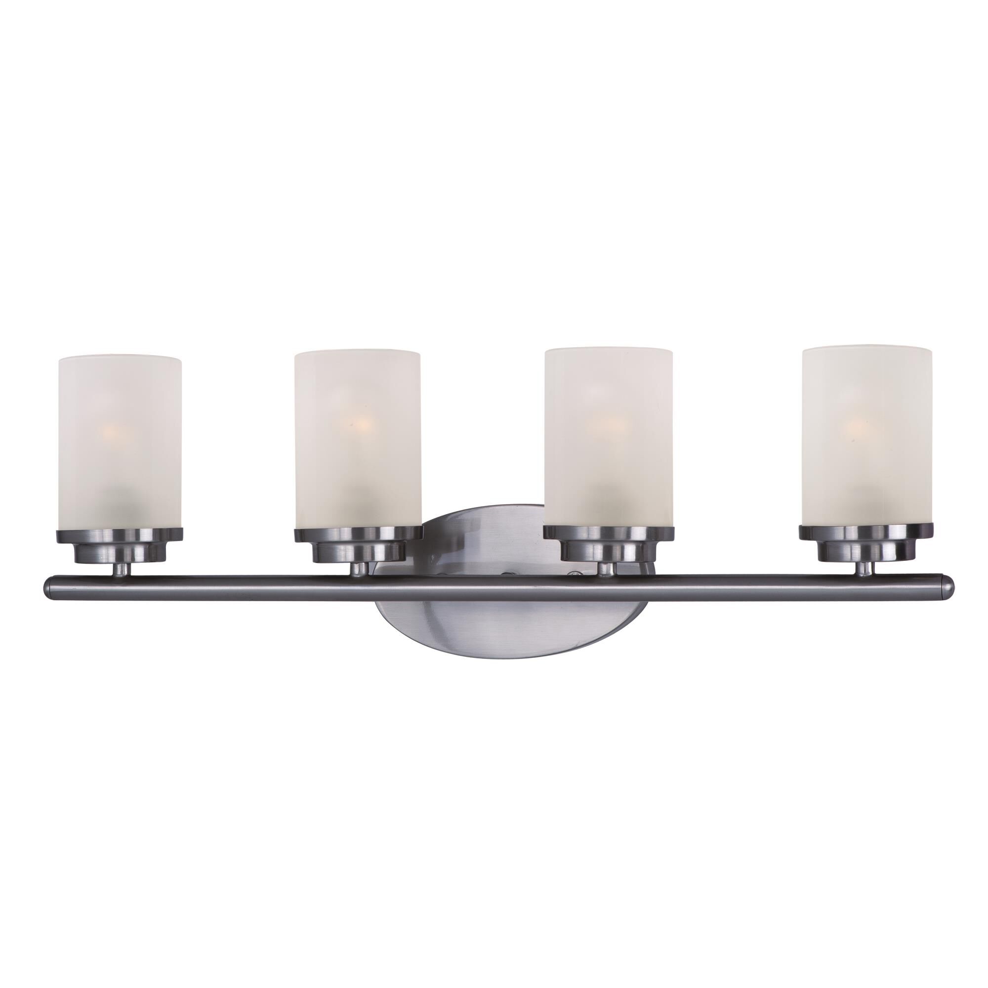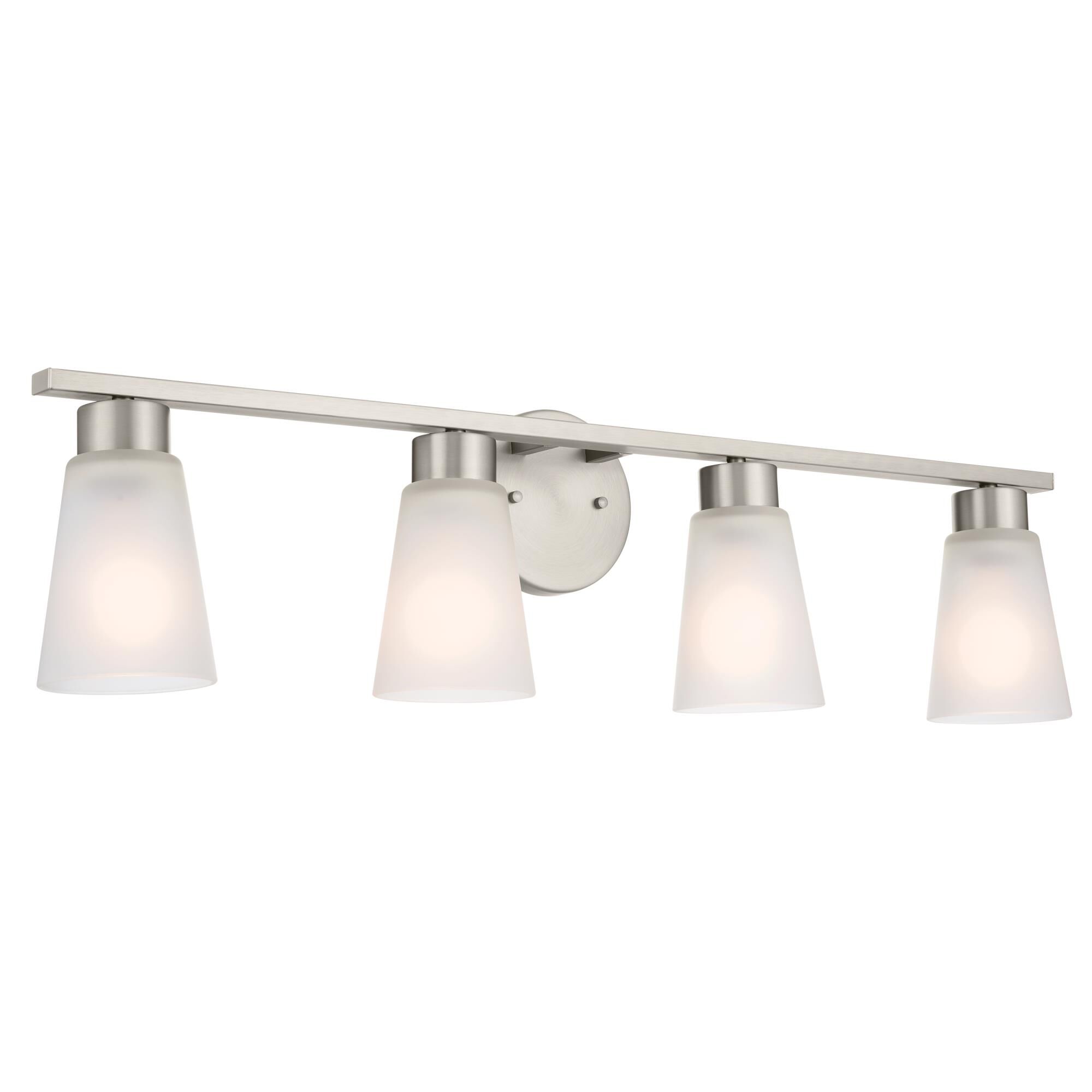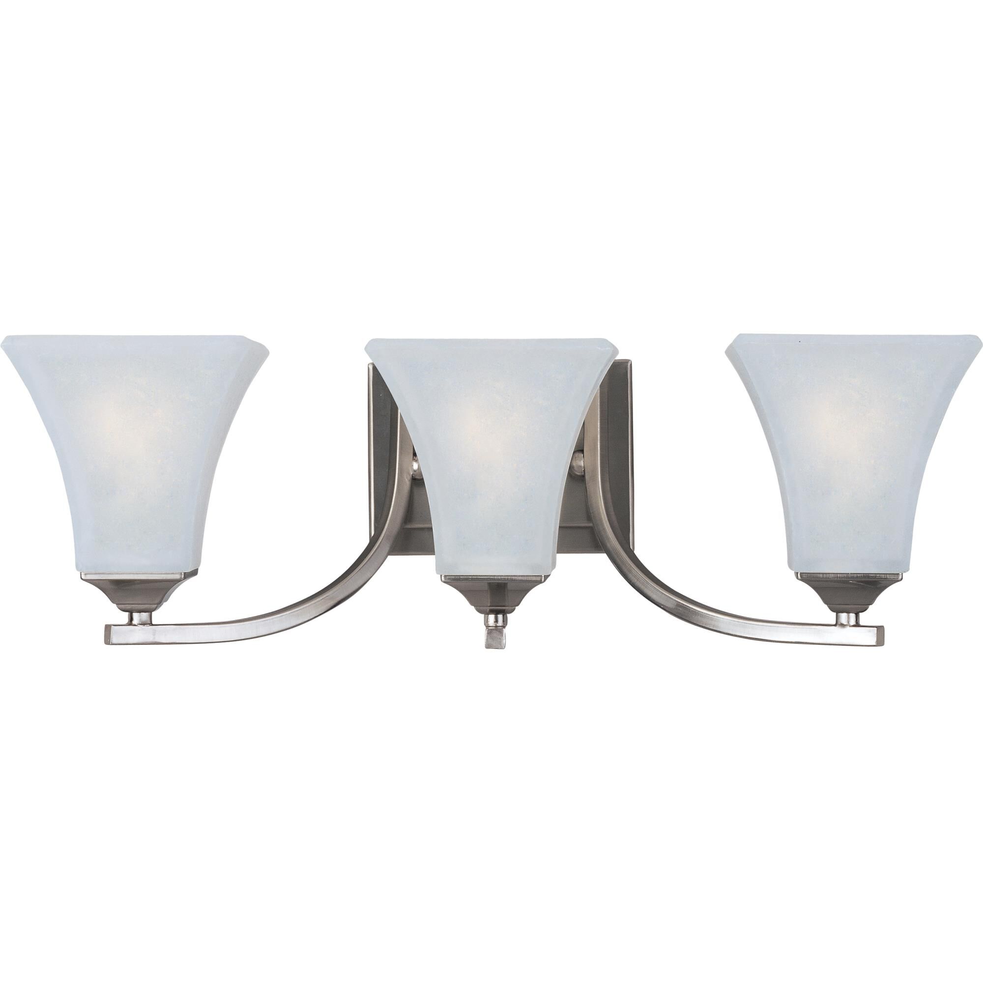 Simply elegant is the best way to describe this three light vanity which features a detailed wall mount finished in brushed nickel and complimented with white swirl glass shades.