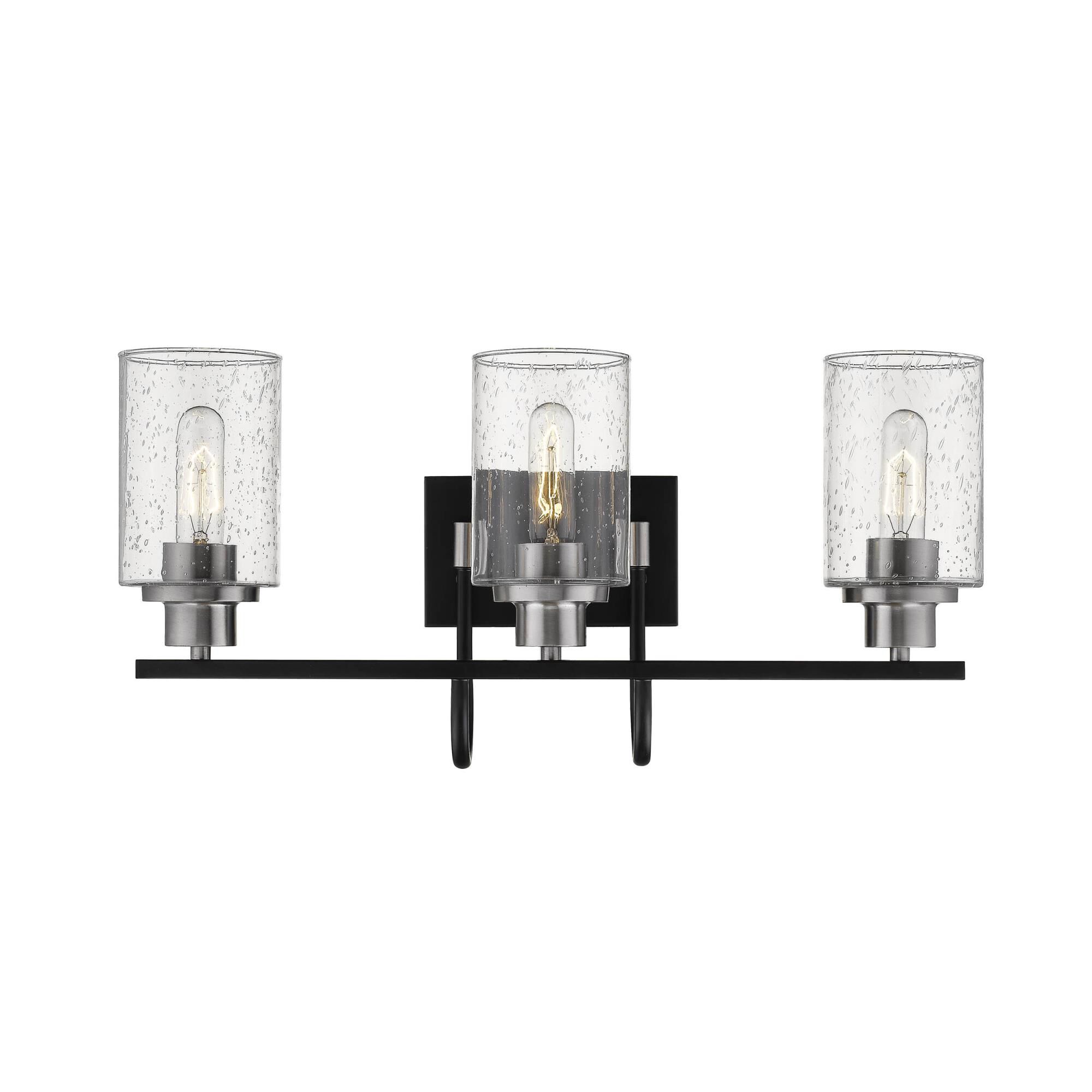 Dress up a guest bath with this enticing three-light vanity light. With a rugged frame finished in brushed steel and soft, romantic clear seedy glass shades, it offers a versatile ambiance that works in both contemporary and transitional dcor schemes.