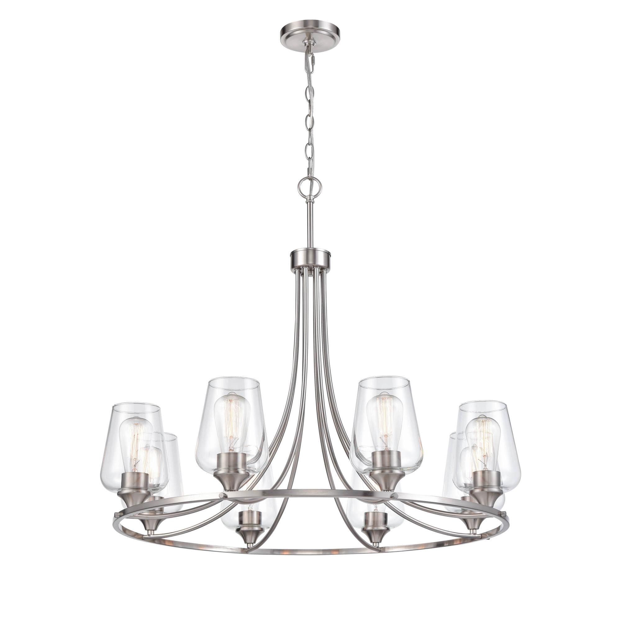 Bring a luxurious fixture to a contemporary or transitional space and enjoy the visual effect of lighting in levels. Fashioned from steel, the brushed nickel frame of this nine-light chandelier hosts an arrangement of romantic clear seedy glass shades in a contoured bell shape, yielding an inspiring decor enhancement that illuminates any space.