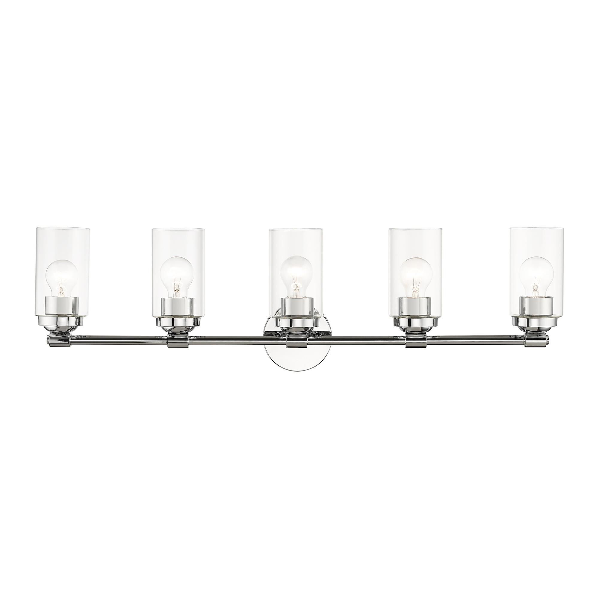 Matte black and shiny brushed nickel marry on the sleek silhouette of this five-light bath light. Decorate a modern bathroom with the elongated silhouette and bright, clear glass shades.