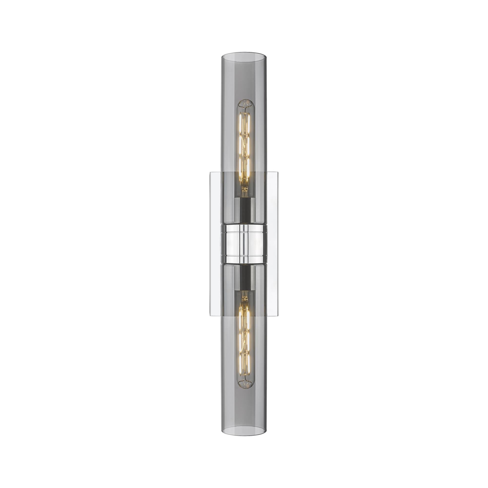 Sleek and elongated, this two-light bath sconce dresses up vanities with bright, modern style. Featuring a rectangular silhouette, the chrome frame is complete with geometric cut out shapes.