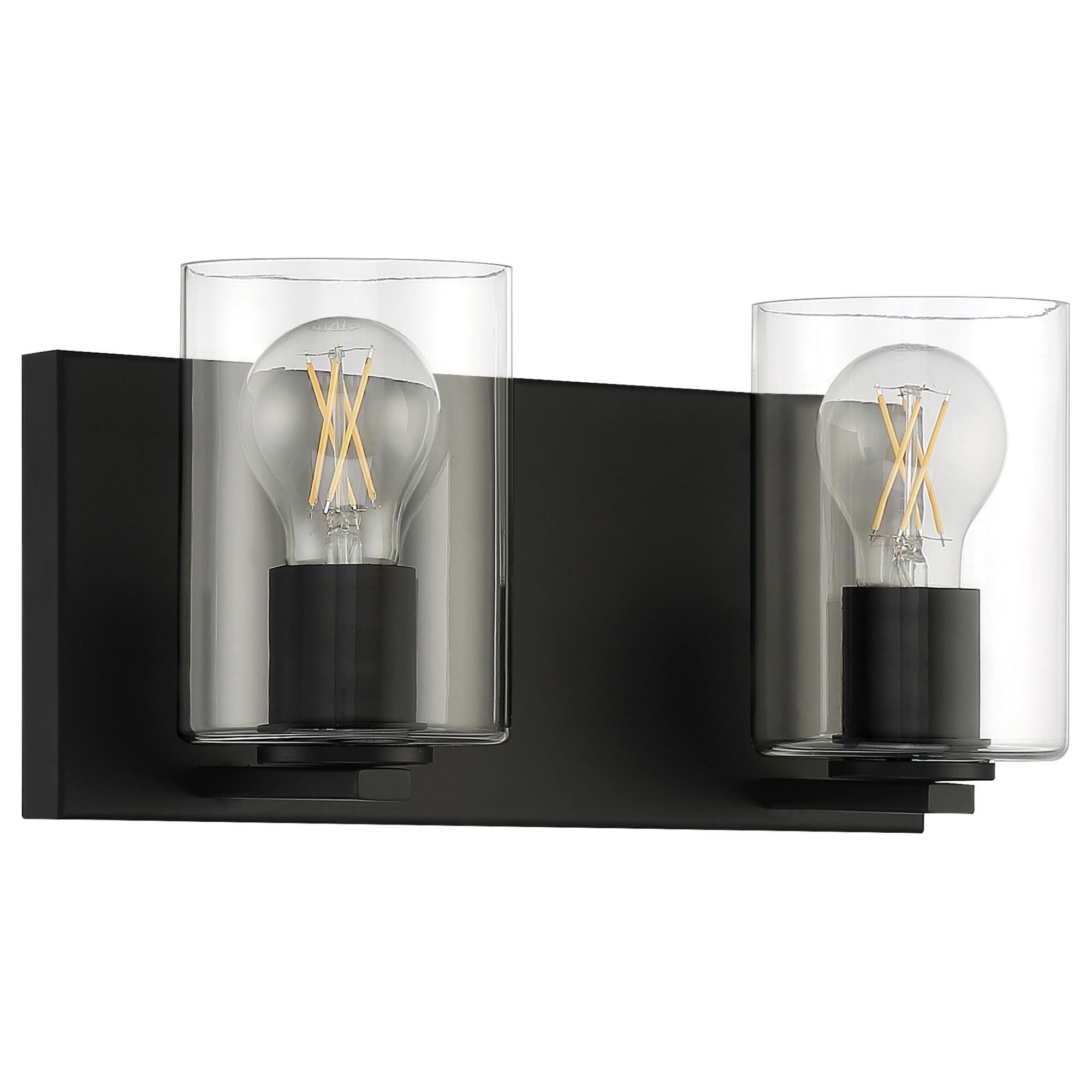 With a sleek cosmopolitan attitude and a beautiful blend of glass and metal, this two-light vanity offers a sophisticated way to stylize a contemporary compact bath space. Matte Black and Brushed Nickel serve as stunning finishes for a tasteful fixture delivering a geometric silhouette and a contrasting palette.