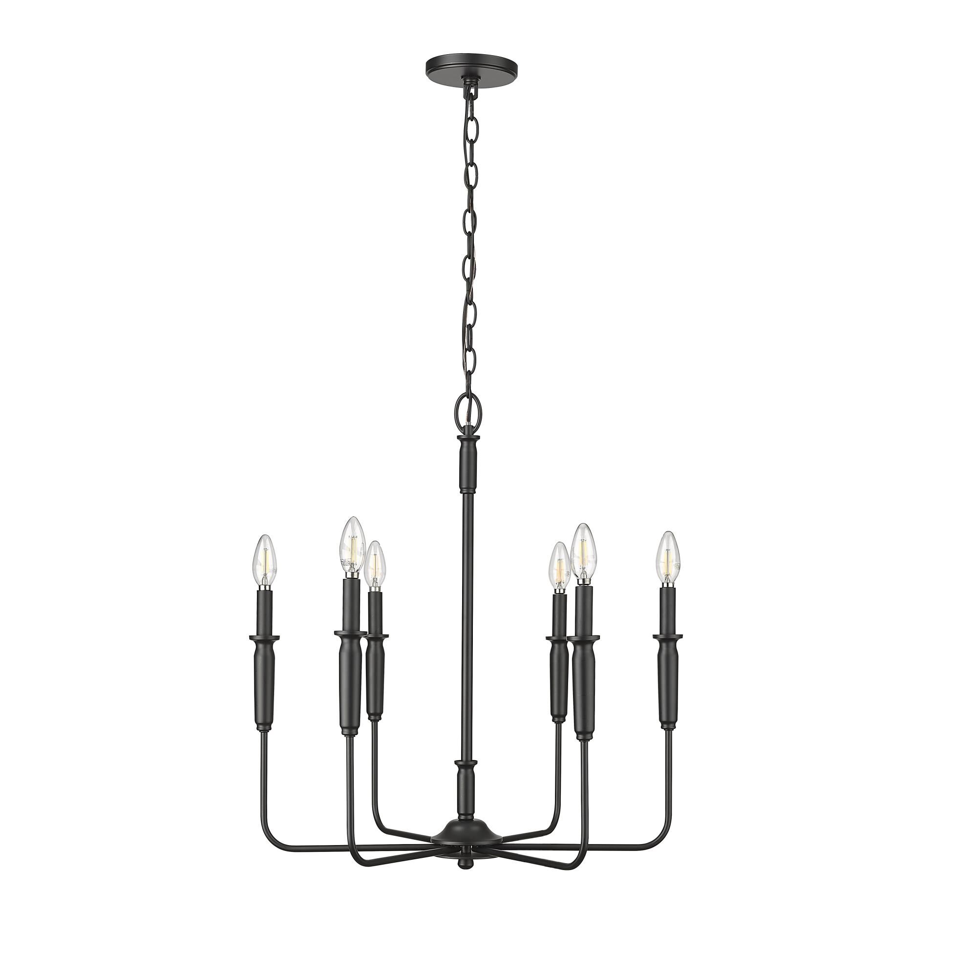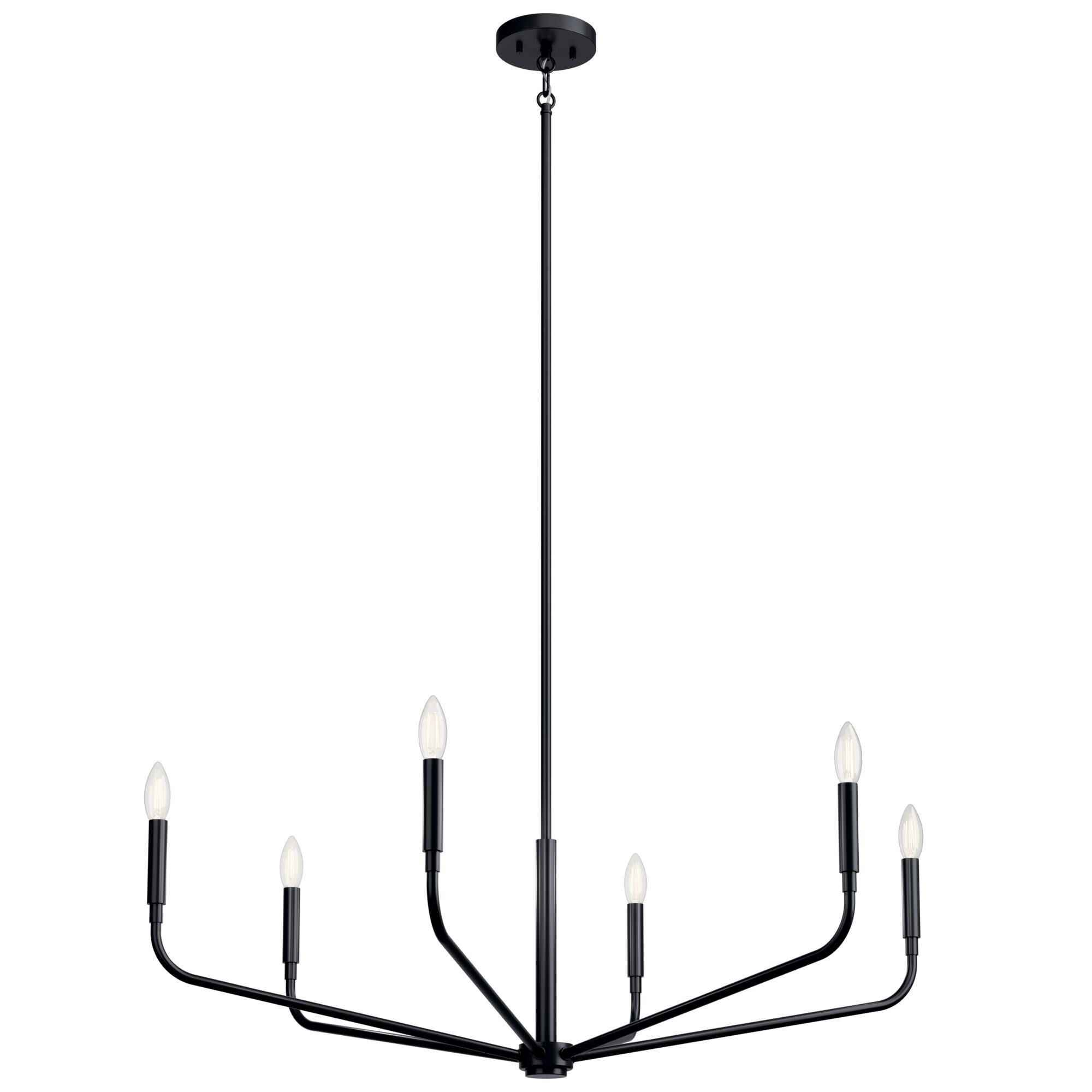 Shapely lines and an alluring shape highlight the design of this two-tone six-light chandelier. It features a candelabra-type design and is crafted in a classic matte black and brushed nickel finish. This delightful chandelier is perfect for the dining room, foyer, kitchen, or entertainment room.