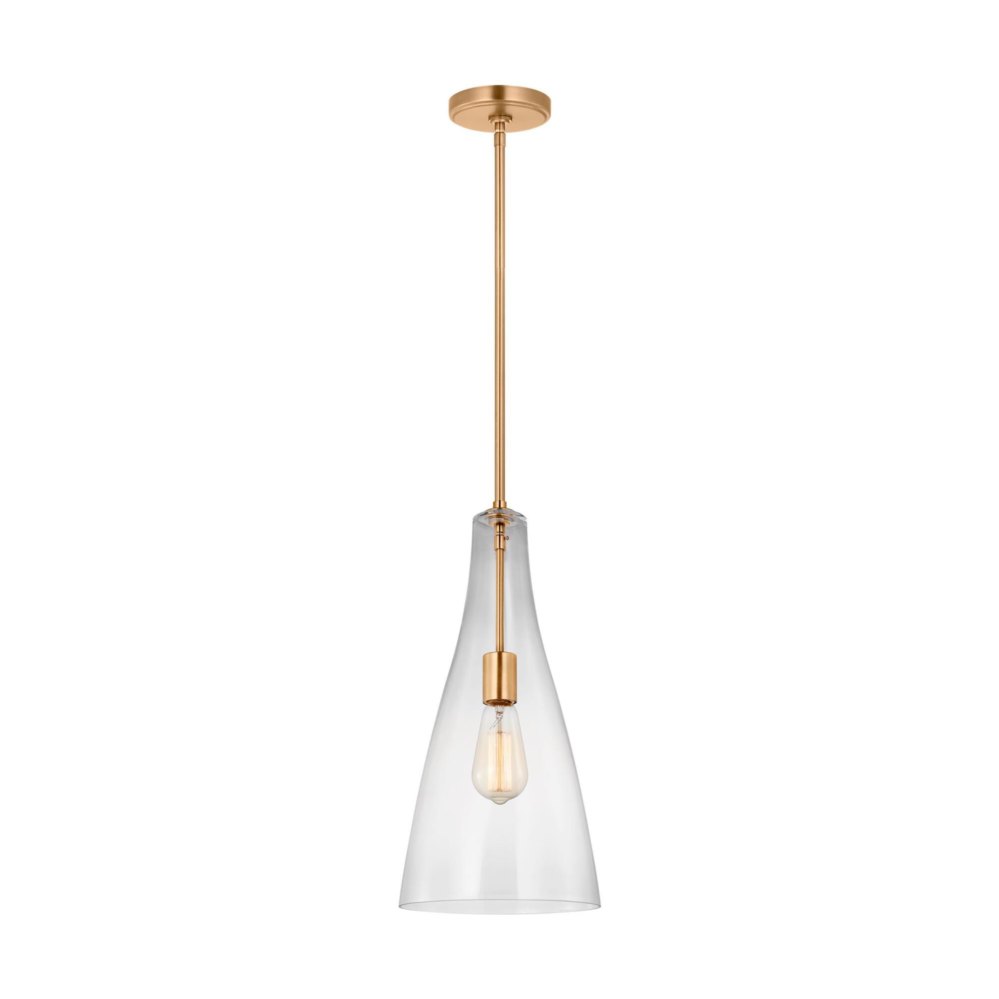 An eye-catching one-light pendant perfectly encapsulates the modern aesthetic. The tapered bell-shaped shade is made from clear glass, suspended from a steel frame with a sleek brushed nickel finish. The fixture brings a chic cutting edge to a contemporary kitchen or dining room.