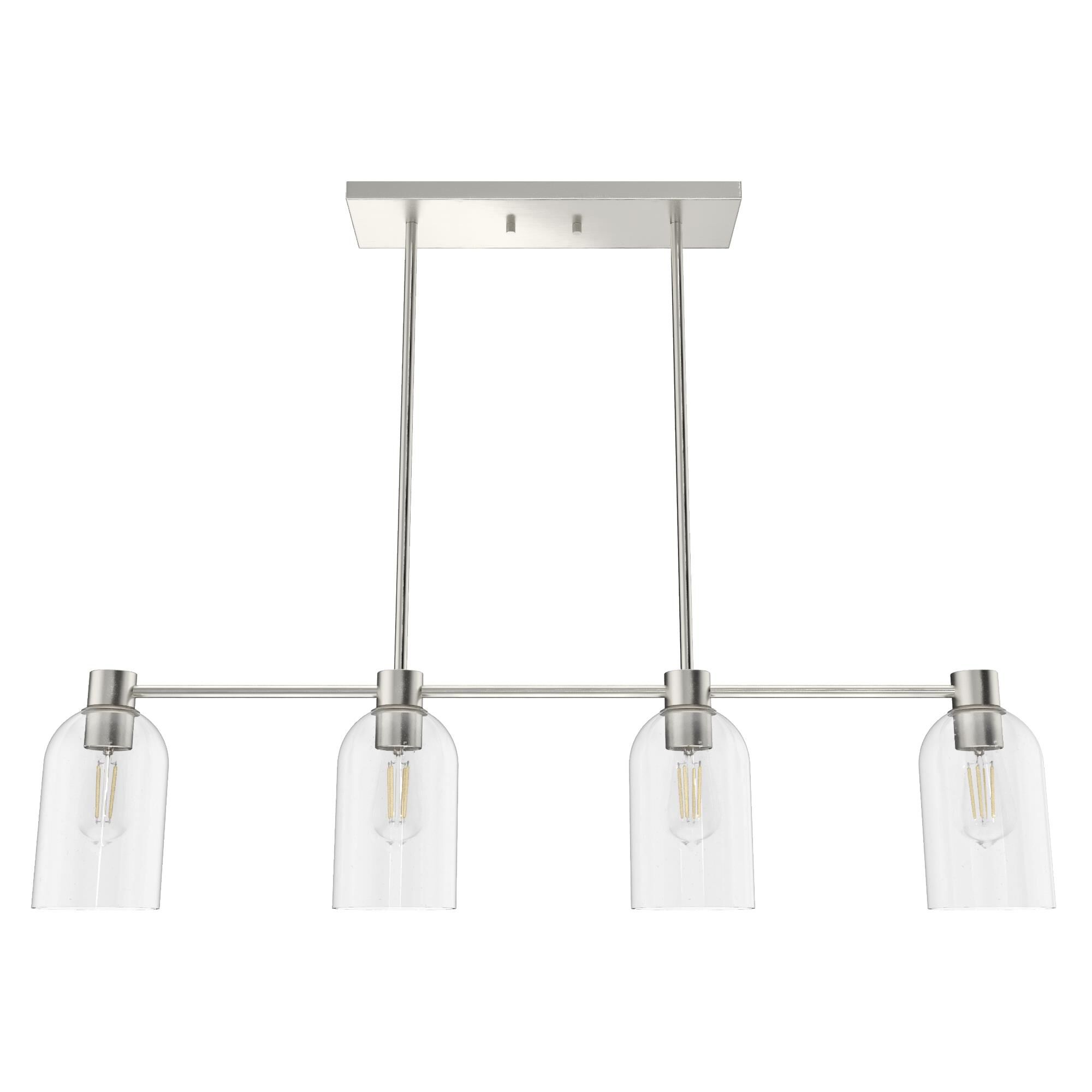 An eye-catching linear style three-light fixture perfectly encapsulates the modern aesthetic. Tapered bell-shaped shades are made from clear glass, suspended from a sleek steel frame with a matte black finish. The fixture brings a chic cutting edge to a contemporary kitchen or dining room.