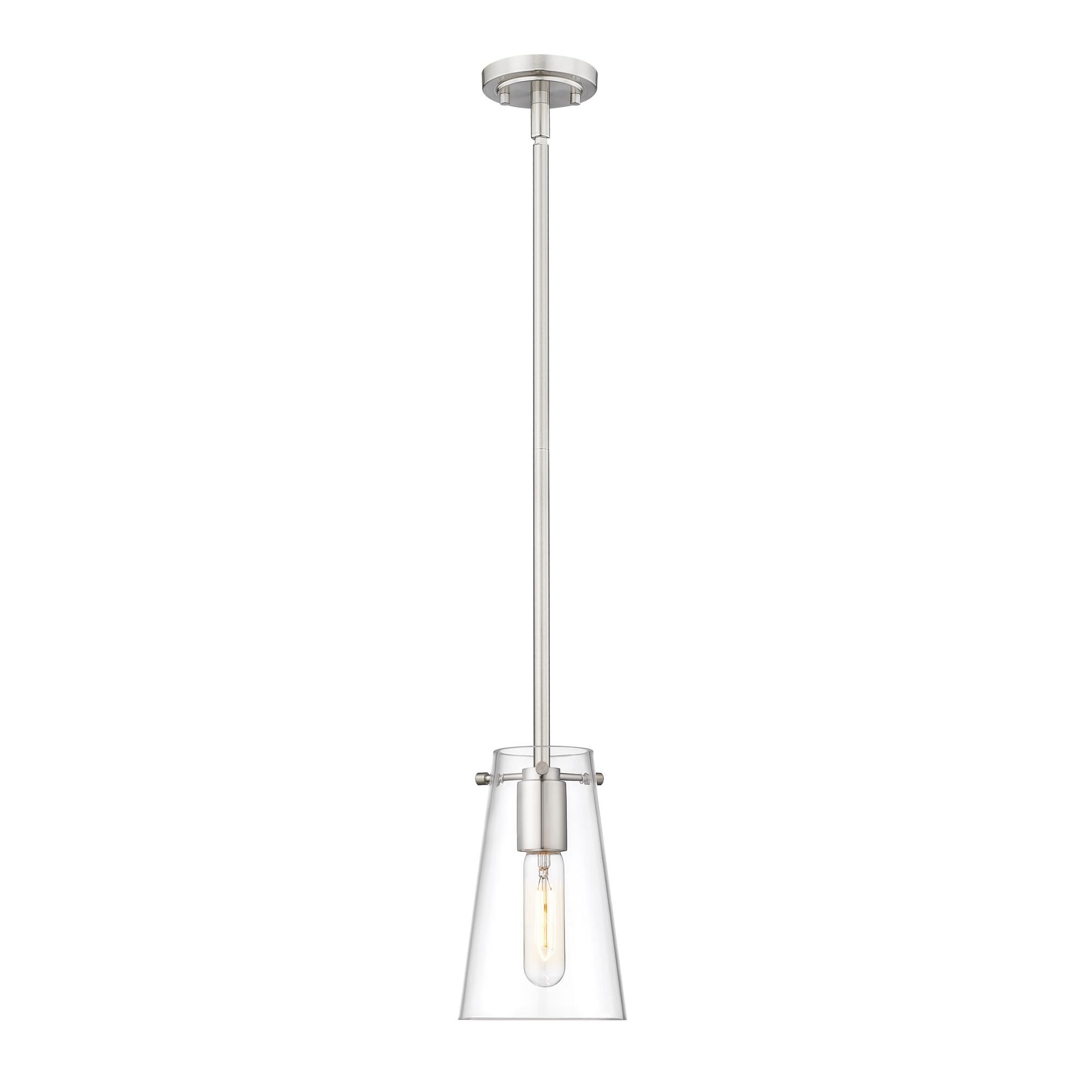 An eye-catching one-light pendant perfectly encapsulates the modern aesthetic. The tapered bell-shaped shade is made from clear glass, suspended from a steel frame with a sleek brushed nickel finish. The fixture brings a chic cutting edge to a contemporary kitchen or dining room.