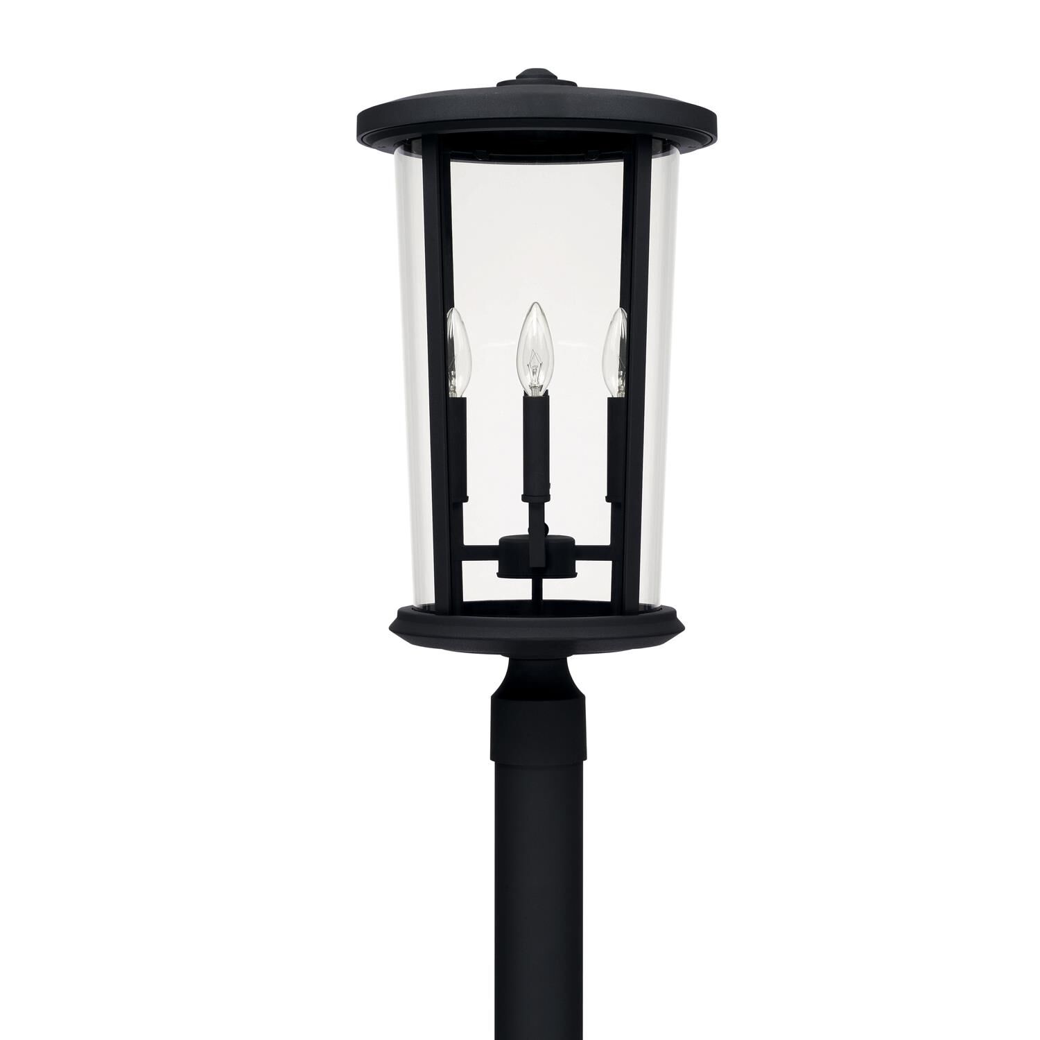 Unique double glass styling and rectangular detailing define the modern styling of this large outdoor post head. Clear beveled glass on the outside with matte opal inner glass creates an elegant glow, while the cast aluminum hardware finished in black can withstand natures seasonal elements.