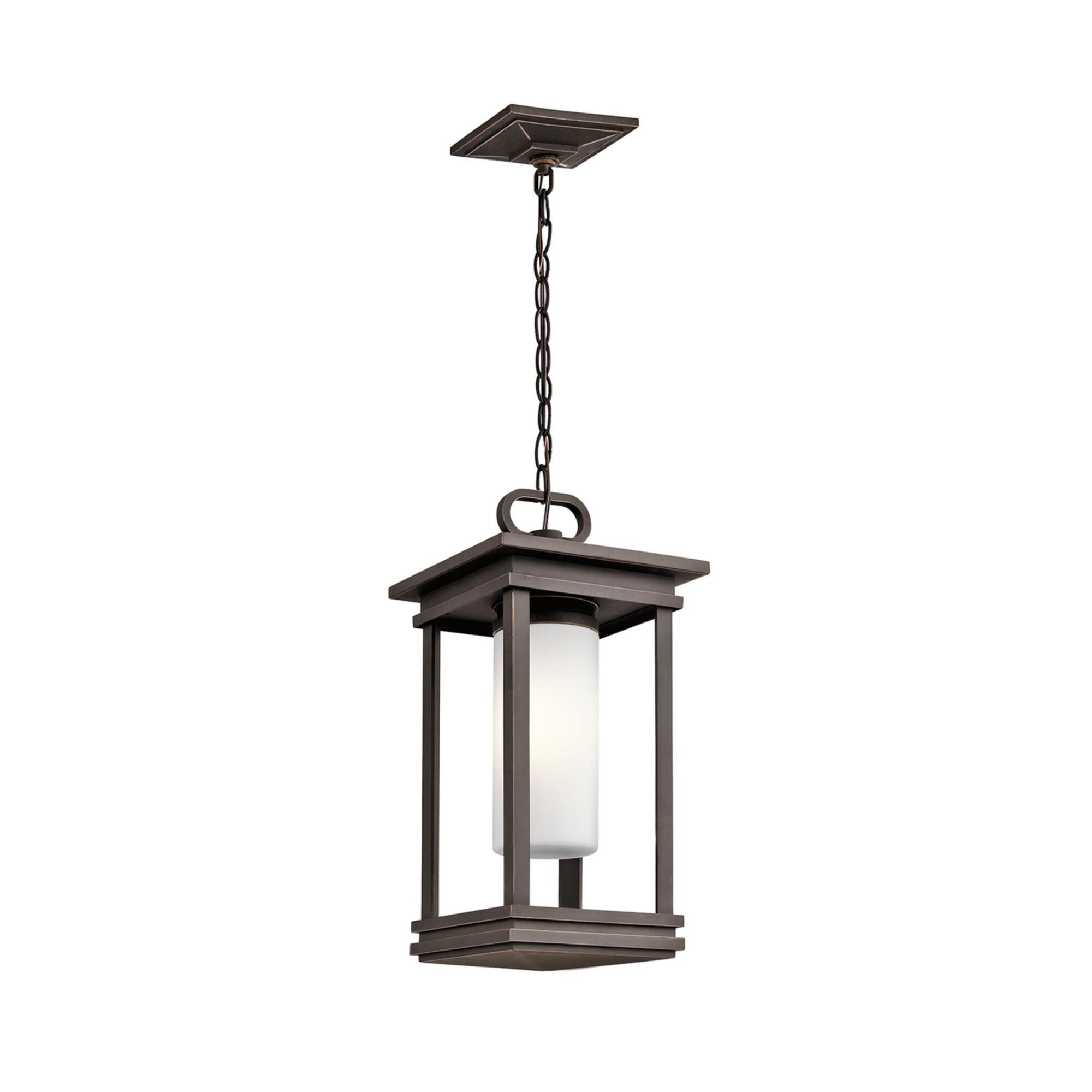 The geometric lines of the Abbey family combine well with contemporary home styling as well as homes in the craftsmen style. This large chain light fixture is made of steel and finished in black with matte opal glass.