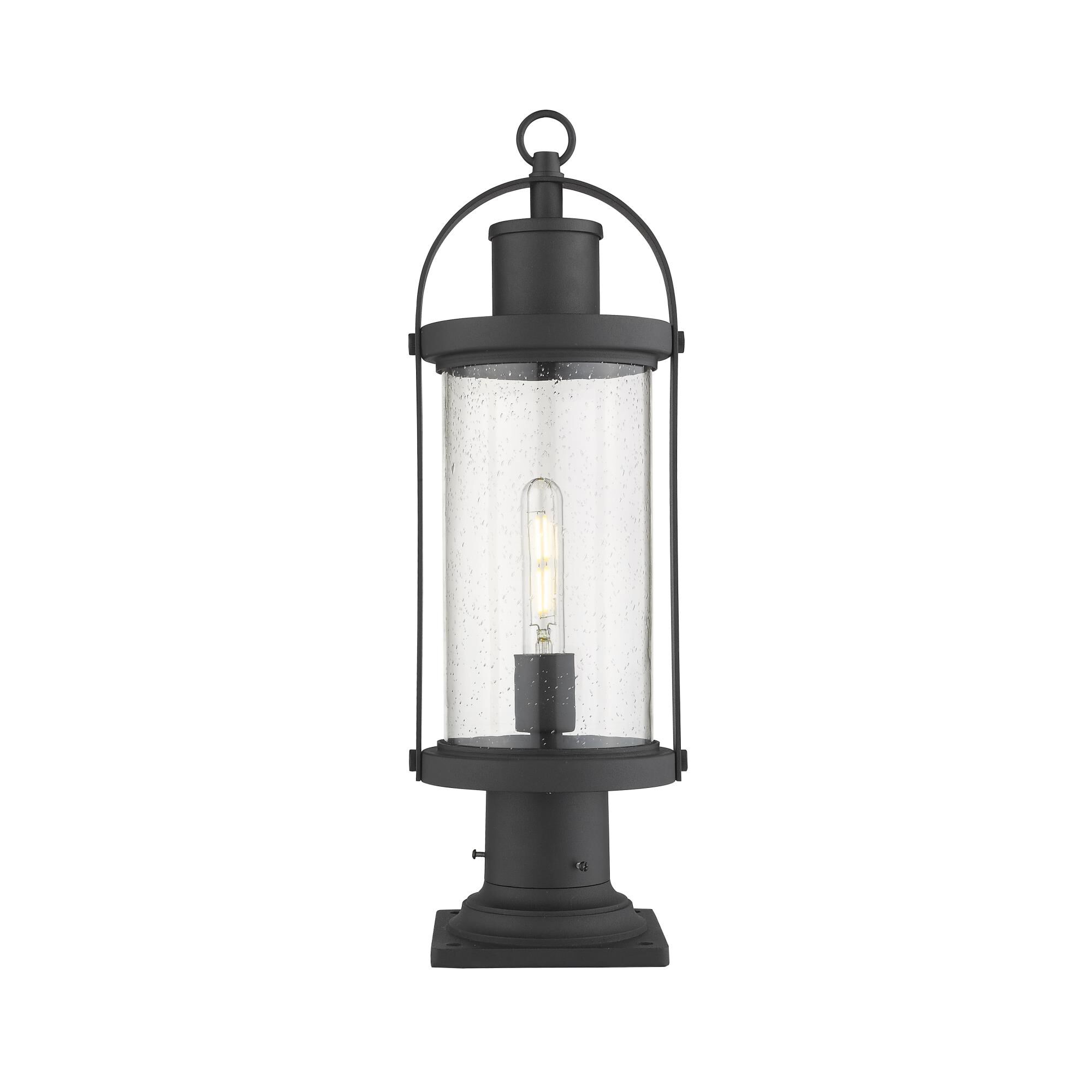 Romantic clear seedy glass offers a textured effect to the cylindrical shade of this outdoor post lantern. Enjoy a bold black finish and an embellished design that complements exterior walkways and garden spaces.