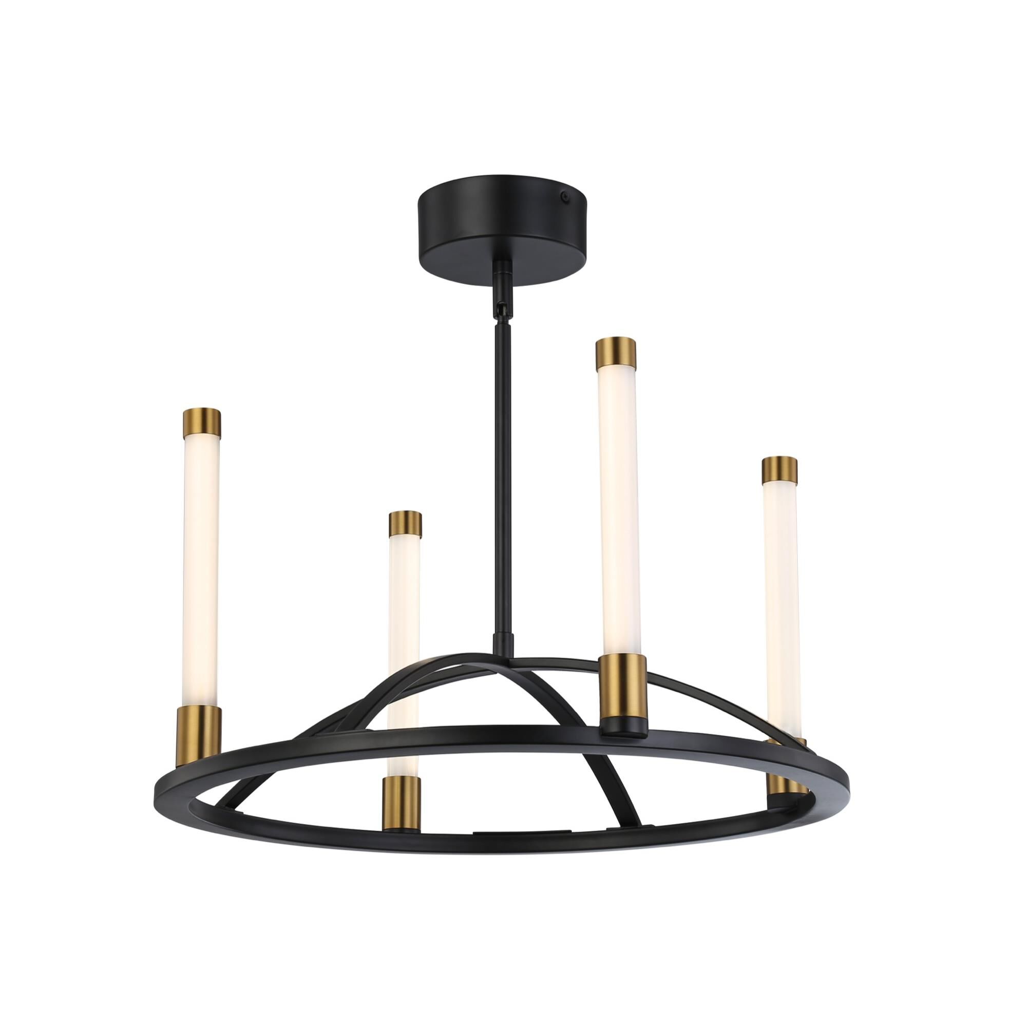 Orbiting metal bands circle the contemporary inner chandelier. This family is made up of round and oval shapes finished in brushed nickel and complimented with matte opal glass.