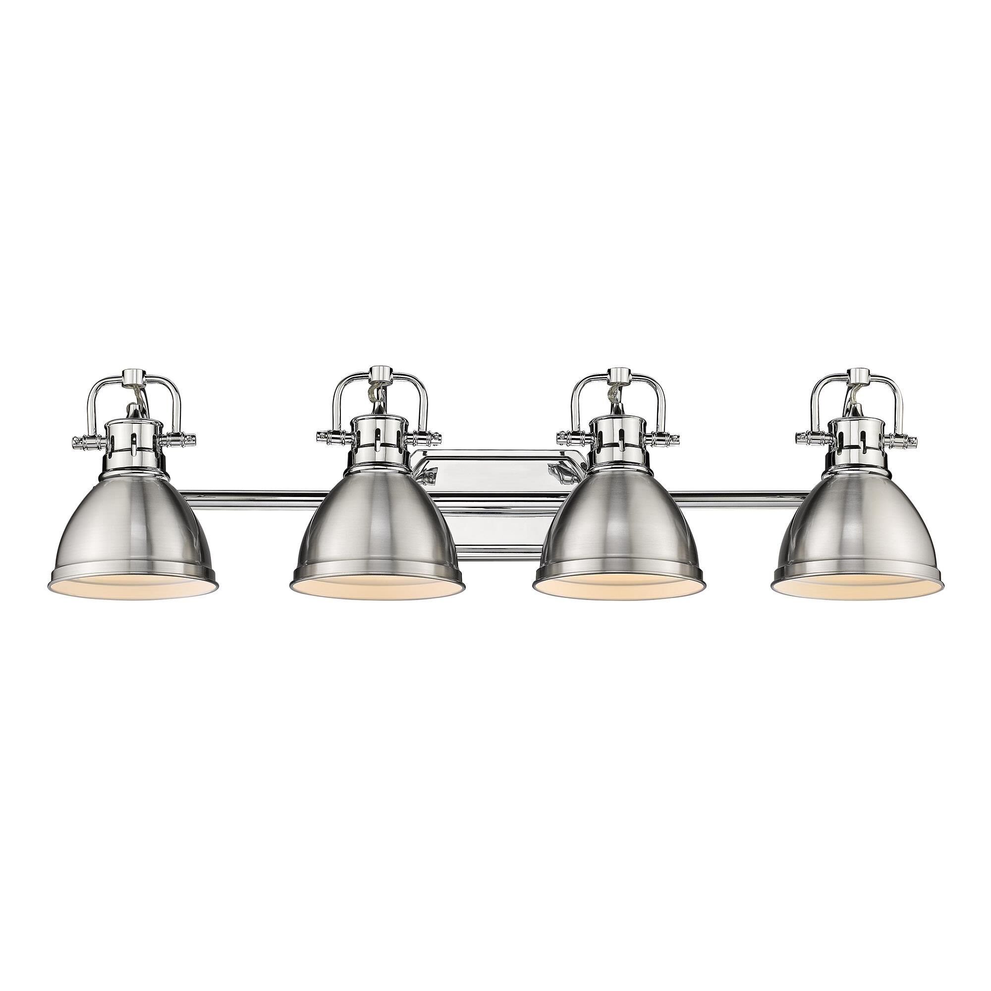 Finish the sophisticated ambiance of a custom designed master en suite with this stylish four-light vanity fixture. A collection of charming hood shades and a mounting bar in brushed nickel finish steel create an ideal host for soft and stylish vintage bulbs.