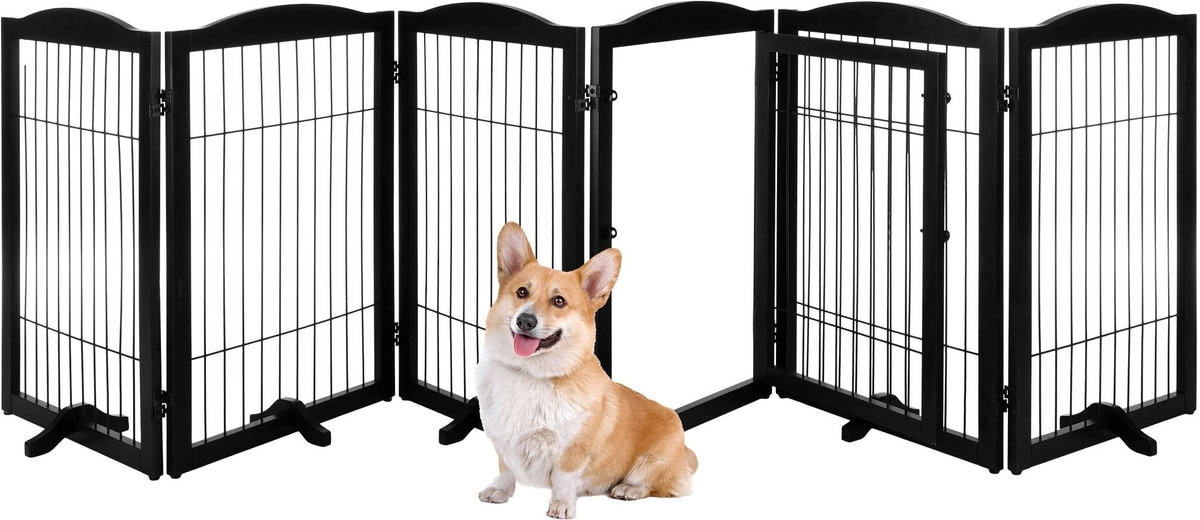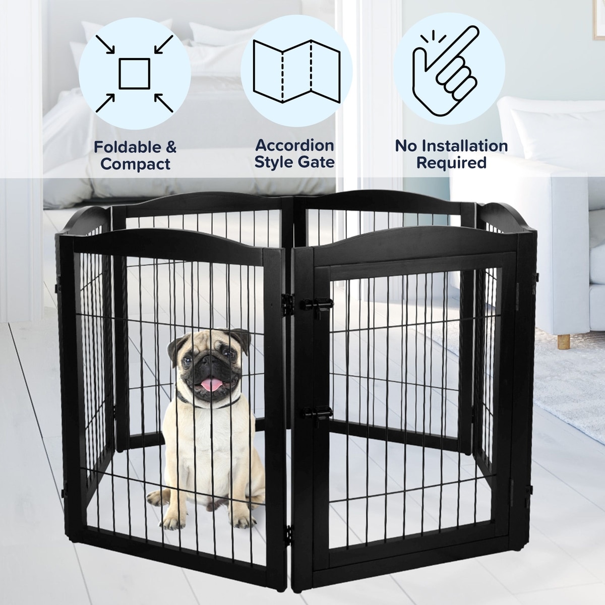 Keep your furry friend out of restricted areas with ease using the Pet Adobe 6-Panel Foldable Dog & Cat Gate. This versatile gate is designed with an accordion-style fold, making it lightweight yet sturdy. Its stylish wood and metal design will complement any home decor. Use it to block off doorways, hallways, and stairs. It can also be configured in a circle or rectangle to create a playpen for your pup or kitty.