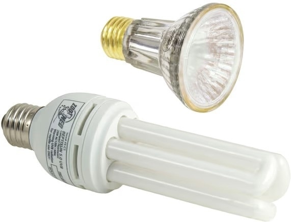 The Repti Tuff Splashproof Halogen Lamp is 50 watts and ReptiSun® 5.0 Mini Compact Fluorescent is 13 watts.