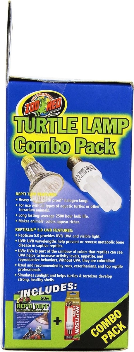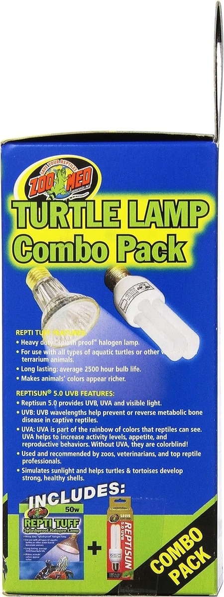 Light up your terrific turtle’s life with the Turtle Lamp Combo Pack from Zoo Med! This convenient lamp bundle is perfect for both new and existing turtle terrariums, helping satisfy the essential heat, UVA and UVB needs of your favorite shelled sidekick. Including both the Repti Tuff Splashproof Halogen Lamp and ReptiSun 5.0 UVB Compact Fluorescent Lamp, this bundle provides both a basking site and full-spectrum output.