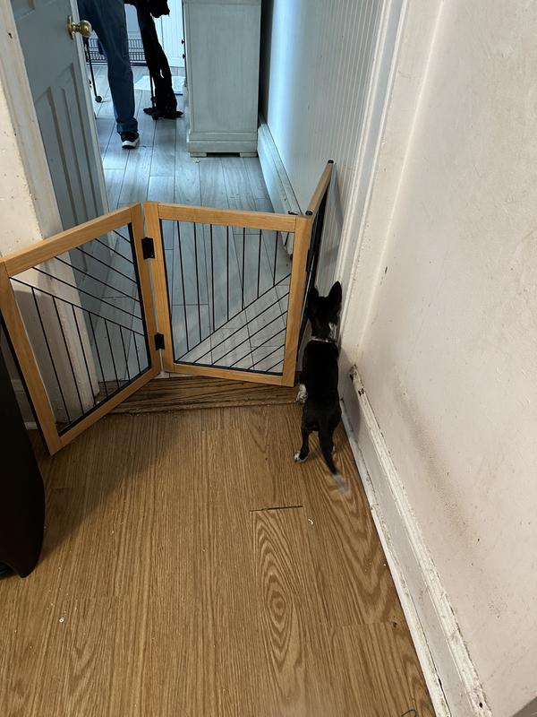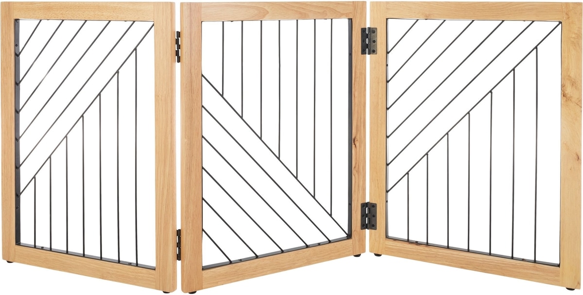 Keep your furry friend out of restricted areas with ease using the Pet Adobe 3-Panel Foldable Dog & Cat Gate. This accordion-style gate is designed to be lightweight yet sturdy, making it easy to move around your home. Its wood and metal design adds a touch of style to any room. Plus, it’s freestanding and doesn’t require any installation that could potentially damage your walls. Use it to limit your pet’s access to certain areas like the top or bottom of stairways, hallways, or doorways. And when not in use, simply fold it together for compact storage at home or on the go. This gate is a must-have for pet parents looking to maintain a modern and pet-friendly home.