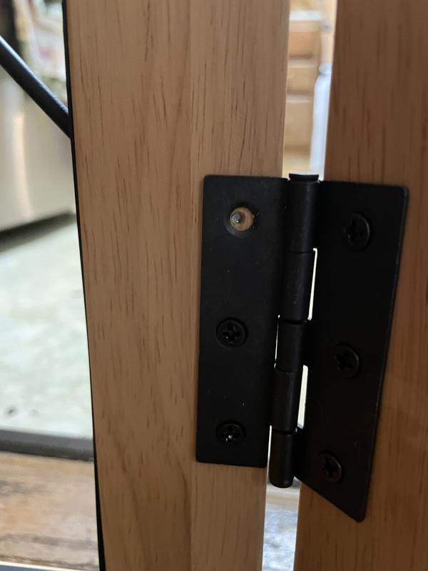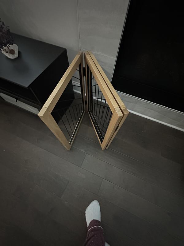 When I first got it, I loved the panels and thought: “OK four hinges - this should be easy!” It was not easy. It was hard to line up, and one of the (very teeny) screws actually broke off in the hole. We could not get it out to use a new one. It took an hour for these four screws. Also, the gate leans up against the wall - there is nothing to secure it. This means my dogs can knock it over easily. I do love the panels. They are really sturdy wood with a nice wire mesh. Very attractive and strong. I will use it, though I’ll have to figure out a good way to secure it when the dogs absolutely have to stay confined.