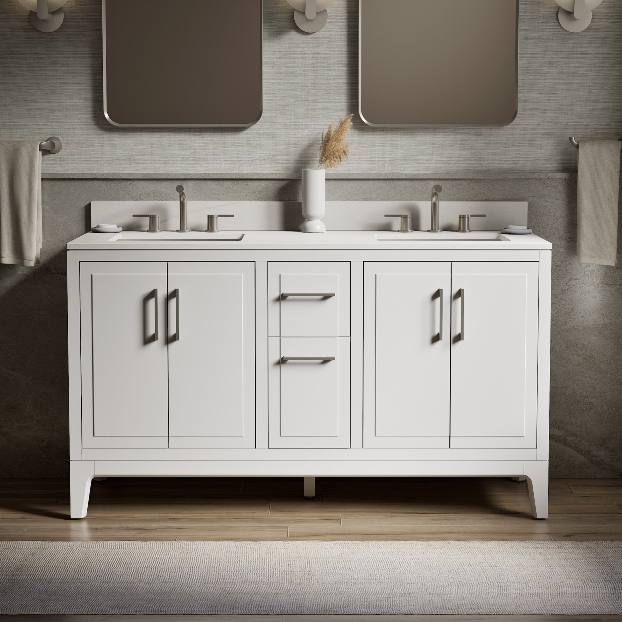 - Vitreous China Sink, Quartz Vanity Top and Matching Backsplash Included