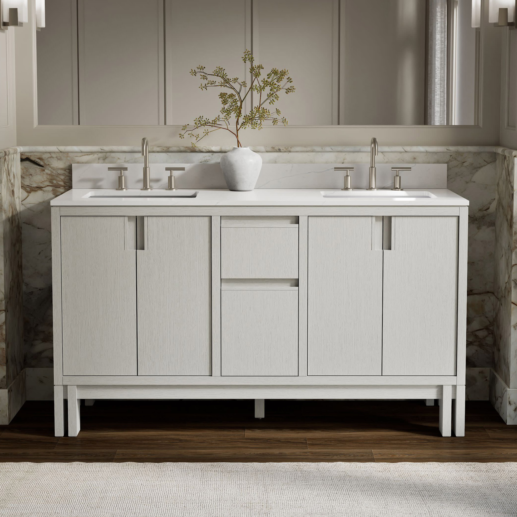 - Includes Cabinet, Precut Quartz Vanity Top, Backsplash, and Sinks
