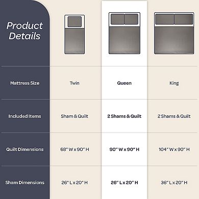 - Includes two standard pillow shams and a matching quilt