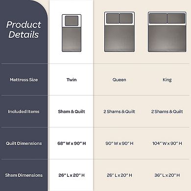 - Quilt: 0.5"H x 68"W x 90"L
