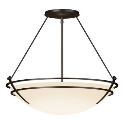 We ordered the large Presidio Tryne Bowl pendant along with other Hubbardton Forge fixtures for a new craftsman style home. We chose the opal glass and the bronze finish. When lit it casts a beautiful light in the living room. The large size of the fixture makes it a focal point of the room and complements the updated craftsman style of the home.