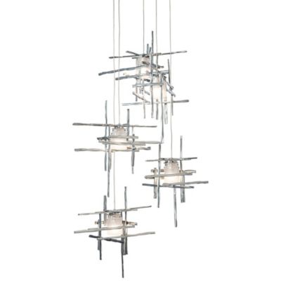 The sculptural focal point you need in tall interiors. The Tura Round Multi-Light Pendant by Hubbardton Forge impresses in both its scale and distinctive artistry. Each of the included pendant lights features an annealed aluminum cage, with every bar textured by hand before being welded together and placed over a thick cylinder of glass. This configuration is designed to be customized; the pendants all come with field-cuttable lengths of wire that allow them to hang at staggered heights from their shared canopy.