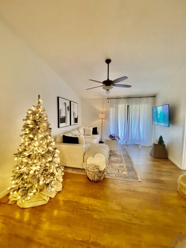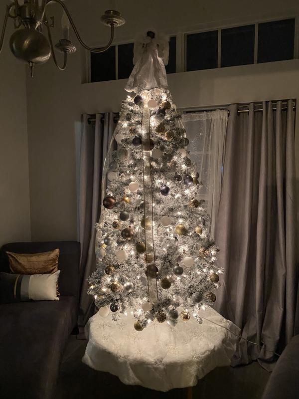 Beautiful tree for our office! Had to vacuum after putting it up because a lot of the flocking came off. Overall we're very happy with it. Nice, full branches and perfectly lit.