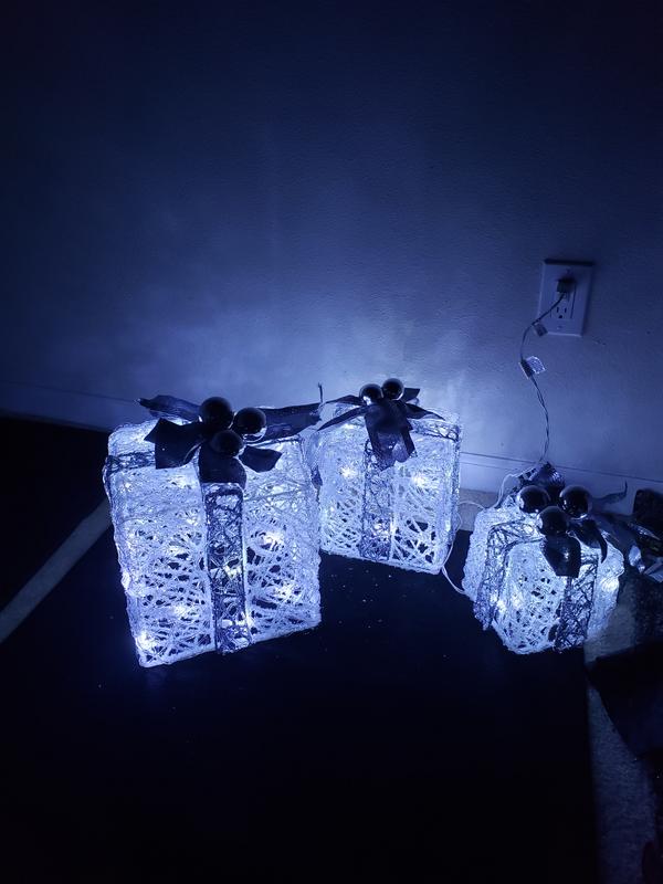 Very disappointed with this product. There was no lid for each of the boxes and they are not blue, as pictured. The bows and ornaments are not sturdy enough for outdoor use.