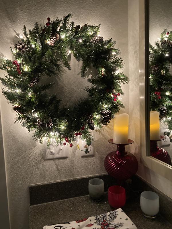 The wreath is beautiful but misleading. There is no mention in the description that it needs an electrical outlet for the lights. How many front doors have an outlet? The cord is very short limiting where it can be displayed. I was fortunate to find an indoor location where it could be hung and plugged in without the plug showing. If not, it would have been returned.