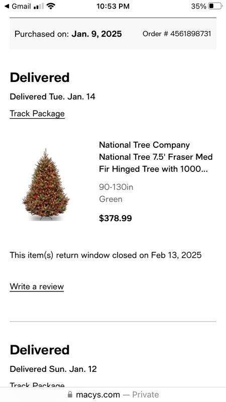 I ordered this Christmas. I never open the box until last week. The Frasier Christmas tree I ordered was not a Frazier tree,I believed that Macy’s would never Cheap their Customer. They send me a tree that was from 30 years ago. not LED lights, not 1000 lights the branches falling off. So upset. I save for 2 years for this Christmas tree.