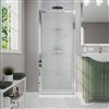 One panel pivot shower door with privacy glass and frame in chrome. Ideal for small bathrooms and DIY renovations. It features multiple water management features designed to keep the water in the shower and prevent leaks.