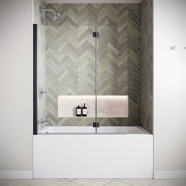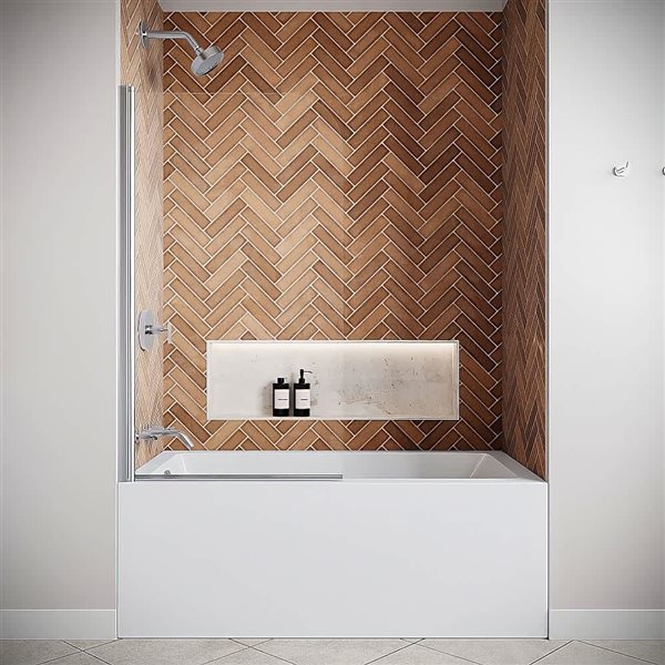 The Aqua Uno tub door from DreamLine blends a fresh look with a sophisticated frameless design for an amazing value. It combines a striking curved silhouette and a uniquely modern look in a single panel swing door for a touch of brilliance to your bathroom. This shower door measures 34.31" x 58" in chrome colour.