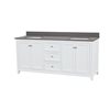 Elevate your bathroom with the Vanuria bathroom vanity, a refined blend of classic elegance and modern sophistication. Made from solid oak for long-lasting durability, this freestanding vanity is sealed with a protective lacquer that resists moisture and preserves its flawless finish. Designed for both style and function, it offers a spacious layout with four cabinet doors and three soft-close drawers for smooth, quiet access. The rectangular undermount ceramic sinks include a built-in overflow to help prevent spills, while the predrilled countertop allows for quick installation of 8-in widespread faucets (not included). A matching 4-in backsplash adds a polished finish. Available in multiple sizes, finishes, countertop materials, and hardware colours, the Vanuria adapts to any space. With two cUPCus-certified sinks and a 5-year limited warranty, this vanity delivers dependable quality and versatile design.