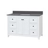 Elevate your bathroom with the Vanuria bathroom vanity, a refined blend of classic elegance and modern sophistication. Made from solid oak for long-lasting durability, this freestanding vanity is sealed with a protective lacquer that resists moisture and preserves its flawless finish. Designed for both style and function, it offers a spacious layout with two cabinet doors and six soft-close drawers for smooth, quiet access. The rectangular undermount ceramic sink includes a built-in overflow to help prevent spills, while the predrilled countertop allows for quick installation of an 8-in widespread faucet (not included). A matching 4-in backsplash adds a polished finish. Available in multiple sizes, finishes, countertop materials, and hardware colours, the Vanuria adapts to any space. With a cUPCus-certified sink and a 5-year limited warranty, this vanity delivers dependable quality and versatile design.