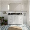Elevate your bathroom with the Vanuria bathroom vanity, a refined blend of classic elegance and modern sophistication. Made from solid oak for long-lasting durability, this freestanding vanity is sealed with a protective lacquer that resists moisture and preserves its flawless finish. Designed for both style and function, it offers a spacious layout with two cabinet doors and six soft-close drawers for smooth, quiet access. The rectangular undermount ceramic sink includes a built-in overflow to help prevent spills, while the predrilled countertop allows for quick installation of an 8-in widespread faucet (not included). A matching 4-in backsplash adds a polished finish. Available in multiple sizes, finishes, countertop materials, and hardware colours, the Vanuria adapts to any space. With a cUPCus-certified sink and a 5-year limited warranty, this vanity delivers dependable quality and versatile design.