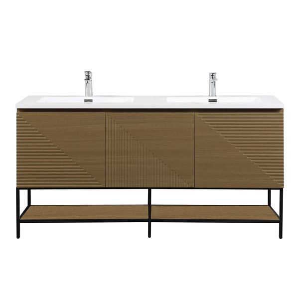Transform your bathroom with the Zidea vanity, where modern luxury meets everyday functionality. Designed with a sleek wall-mounted profile, this vanity creates a spacious, contemporary look while offering practical storage. Crafted from solid oak and sealed with a protective lacquer, it ensures durability and moisture resistance for long-lasting beauty. The seamless solid surface top features two integrated sinks with predrilled single faucet holes (faucets not included) allows for effortless installation, while the absence of a backsplash invites creative customization with your choice of tiles. The brushed gold hardware adds a refined touch, enhancing the vanity’s sophisticated appeal. Available in multiple sizes to fit your space, the Zidea vanity is backed by a 5-year limited warranty, delivering both quality and elegance.