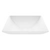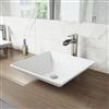 The VIGO Hibiscus vessel sink showcases a modern and elegant design that enhances any bathroom decor. This white sink features a sleek, square shape with gently sloping sides, measuring 16-in. L x 16-in. W x 5-in. H. Its matte white finish gives it a smooth, contemporary look that complements various styles, from minimalist to traditional. The sink is crafted from durable MatteStoneTM, a material known for its scratch and stain resistance, making it easy to clean and maintain. This vessel sink sits atop the counter, creating a striking focal point in your bathroom. Its design allows for flexible placement on different countertop materials, adapting well to various bathroom layouts. The sink's smooth surface and clean lines not only look stylish but also promote better hygiene by preventing water and soap residue buildup. VIGO's attention to functionality and aesthetics is evident in this sink's seamless construction and precise angles.