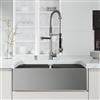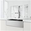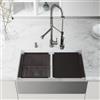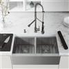 Elevate your kitchen's functionality and style with the VIGO Oxford farmhouse apron-front double-bowl Stainless Steel sink paired with the sleek VIGO Zurich kitchen faucet. This impressive sink measures 33 in. L X 21 in. W X 10 in. D, offering ample space for all your kitchen tasks. The sink's built-in ledge allows you to slide a cutting board or rollup rack across, enhancing your prep area and streamlining your workflow. The stainless steel construction ensures durability and easy maintenance, while the modern design adds a touch of sophistication to your space. The front of the sink features a sleek, seamless apron that beautifully complements contemporary kitchens. Complementing the sink is the 27 in. H Stainless Steel kitchen faucet, boasting a professional-grade spring design for maximum flexibility and reach. This VIGO set is ready to tackle any culinary challenge.