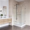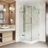 - CORNER SHOWER KIT: Premium corner shower with 40" L X 32" W X 79" H hinged glass, available in chrome or brushed nickel finishes, right drain, textured base, 23" walk-through entry.
