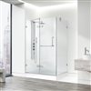 - CORNER SHOWER KIT: Premium corner shower with 40" L X 32" W X 79" H hinged glass, available in chrome or brushed nickel finishes, left drain, textured base, 23" walk-through entry.