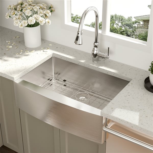 - STYLISH LOOK: the stainless farmhouse sink with fluted front pairs beautifully with the gold pull down faucet creating an elegant and modern kitchen centerpiece.