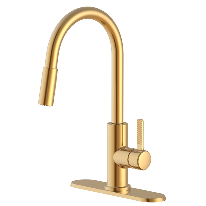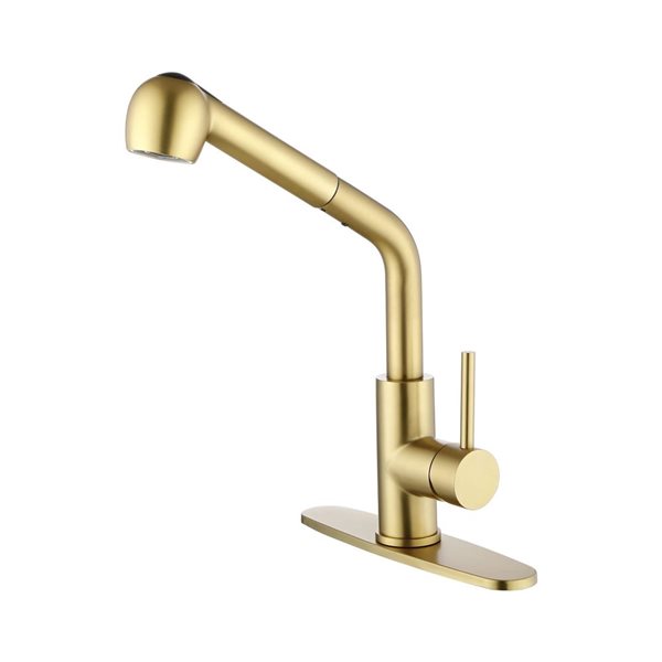 Revamp your kitchen with the Branson Single Handle Pull-Out Sprayer Kitchen Faucet in Matte Brushed Gold. Its low profile is perfect for tight spaces, while the elegant finish adds a touch of contemporary charm. Experience versatility with the extendable sprayer, offering up to 30 inches of reach for an aerated flow or powerful spray. Pair it seamlessly with VIGO's deck plate and soap dispenser in the same finish for a cohesive and stylish upgrade. Upgrade your home with this functional and visually appealing kitchen faucet.